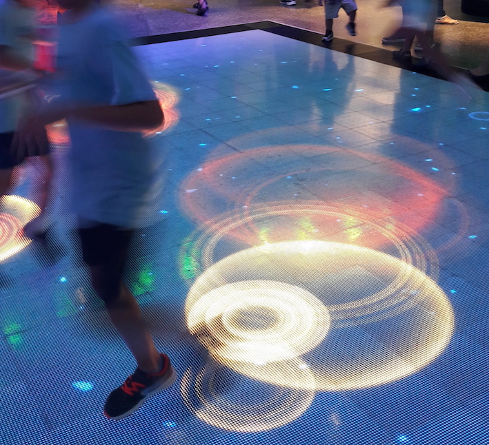 Hay una gran pista de baile que es la atracción favorita de las familias. Al bailar sobre ella cambia de colores y va contabilizando las calorías consumidas con cada paso.