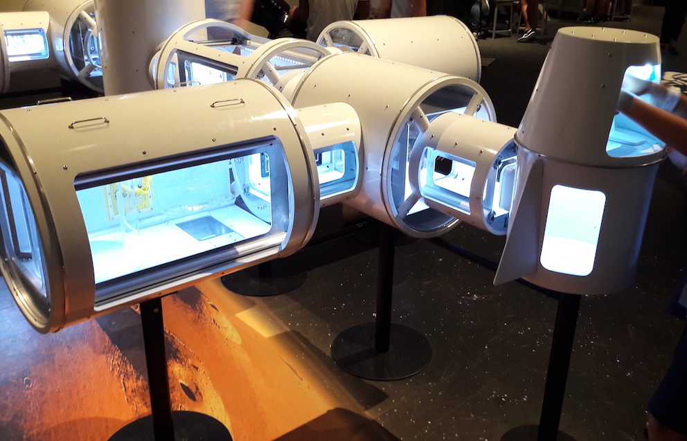 En esta zona dedicada al vuelo hay muchas actividades interactivas para los niños, como esta maqueta de la Estación Espacial Internacional o un modelo de dinosaurio gigante.